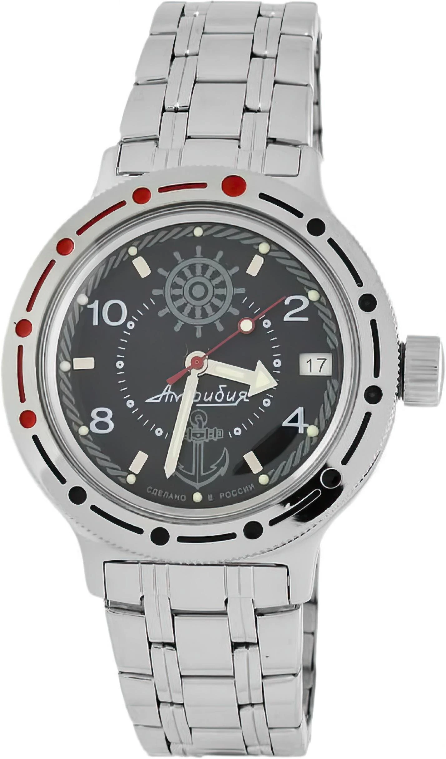 Мужские наручные часы Восток Командирские 420526. Автоматические с ручным подзаводом. Пружина механизма заводится автоматически благодаря естественным движениям владельца в процессе ежедневной носки часов. Также есть возможность ручного завода. Корпус изготовлен из высококачественной нержавеющей стали 316L с высокими антикоррозийными свойствами. На стрелки и отметки нанесен светонакопительный состав, благодаря этому считывать информацию с циферблата возможно и в темноте. На циферблате отображается текущее число месяца. Браслет из нержавеющей стали. Органическое стекло. Часы являются водонепроницаемыми до 20 Бар. Цвет корпуса: Серебристый. Цвет циферблата: Черный. Ширина (с заводной головкой): 42мм. Толщина: 15мм. Гарантия: 1 год.