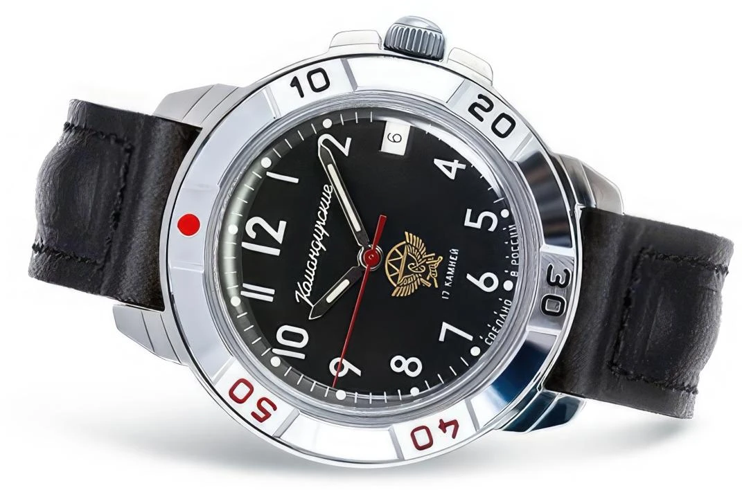 Мужские наручные часы Восток Командирские 43121Б. Механические с ручным подзаводом. Ремешок изготовлен из кожи. Браслет из нержавеющей стали. Органическое стекло. На циферблате отображается текущее число месяца. Часы являются водонепроницаемыми до 3 Бар. Цвет циферблата: Серебристый. Цвет корпуса: Черный. На стрелки и отметки нанесен светонакопительный состав, благодаря этому считывать информацию с циферблата возможно и в темноте. Толщина: 12 мм. Гарантия: 1 год.