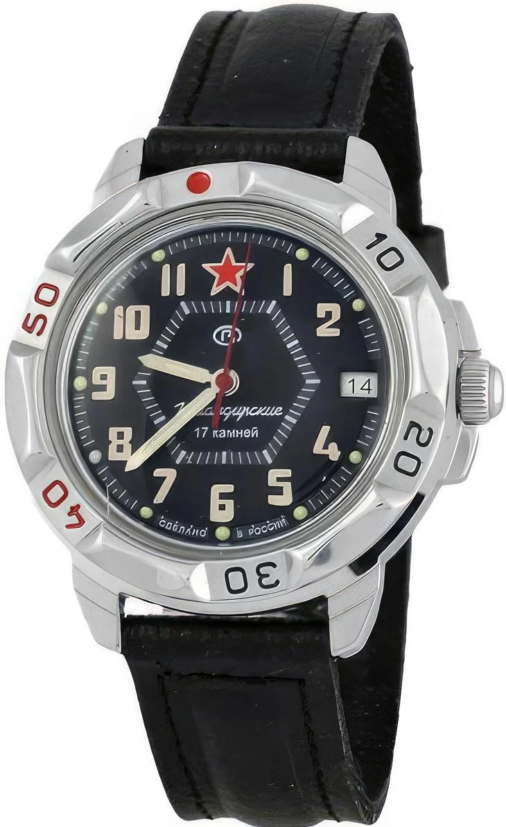 Мужские наручные часы Восток Командирские 431744. Механические с ручным подзаводом. Корпус изготовлен из высококачественной часовой латуни с высокими антикоррозийными свойствами. На стрелки и отметки нанесен светонакопительный состав, благодаря этому считывать информацию с циферблата возможно и в темноте. На циферблате отображается текущее число месяца. Ремешок изготовлен из кожи. Органическое стекло. Часы являются водонепроницаемыми до 3 Бар. Цвет циферблата: Черный. Ширина (с заводной головкой): 40мм. Толщина: 10мм. Гарантия: 1 год.