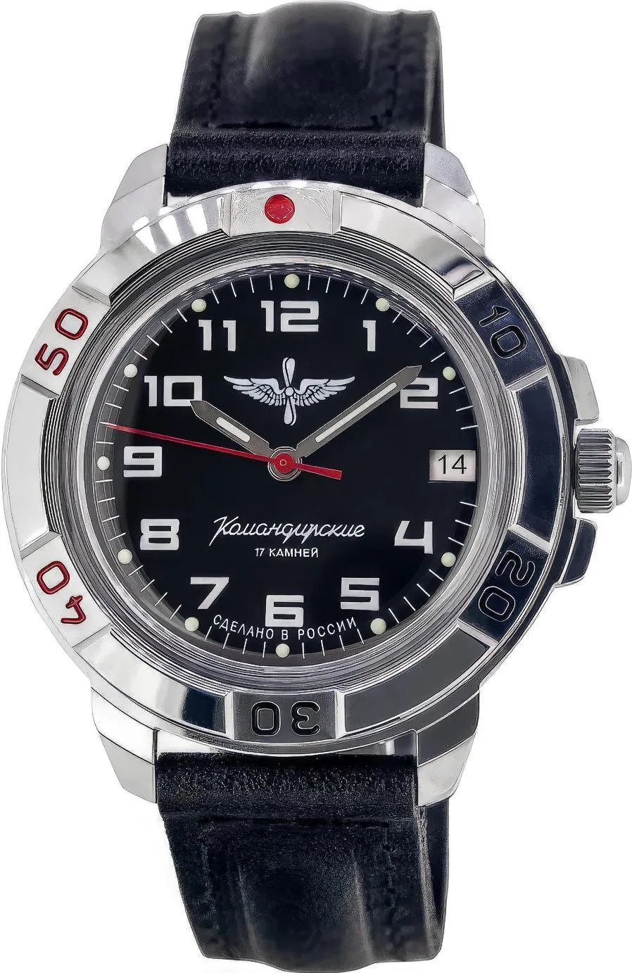Мужские наручные часы Восток Командирские 431941. Механические с ручным подзаводом. Корпус изготовлен из высококачественной часовой латуни с высокими антикоррозийными свойствами. На стрелки и отметки нанесен светонакопительный состав, благодаря этому считывать информацию с циферблата возможно и в темноте. На циферблате отображается текущее число месяца. Ремешок изготовлен из кожи. Органическое стекло. Часы являются водонепроницаемыми до 3 Бар. Цвет циферблата: Черный. Ширина (с заводной головкой): 42мм. Толщина: 15мм. Гарантия: 1 год.