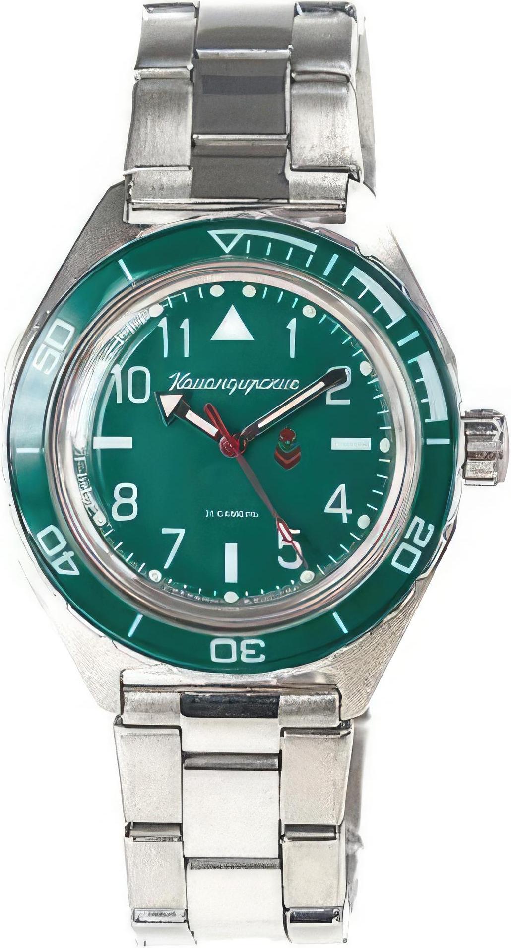 Мужские наручные часы Восток Командирские 650856. Механические с автоподзаводом. Пружина механизма заводится автоматически благодаря естественным движениям владельца в процессе ежедневной носки часов. Корпус изготовлен из высококачественной нержавеющей стали 316L с высокими антикоррозийными свойствами. На стрелки и отметки нанесен светонакопительный состав, благодаря этому считывать информацию с циферблата возможно и в темноте. Браслет из нержавеющей стали. Органическое стекло. Часы являются водонепроницаемыми до 20 Бар. Цвет корпуса: Зеленый. Цвет циферблата: Зеленый. Ширина (с заводной головкой): 46мм. Толщина: 15мм. Гарантия: 1 год.