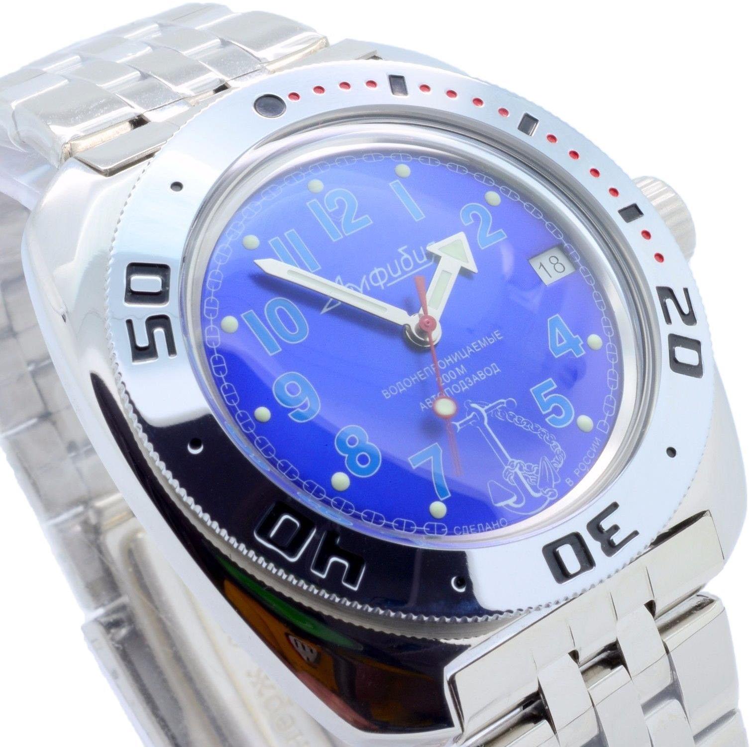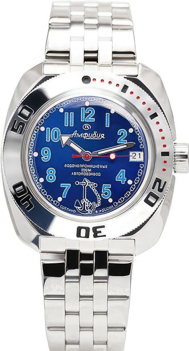Мужские наручные часы Восток Командирские 710382. Автоматические с ручным подзаводом. Пружина механизма заводится автоматически благодаря естественным движениям владельца в процессе ежедневной носки часов. Также есть возможность ручного завода. Корпус изготовлен из высококачественной нержавеющей стали 316L с высокими антикоррозийными свойствами. На стрелки и отметки нанесен светонакопительный состав, благодаря этому считывать информацию с циферблата возможно и в темноте. На циферблате отображается текущее число месяца. Браслет из нержавеющей стали. Органическое стекло. Часы являются водонепроницаемыми до 20 Бар. Цвет корпуса: Синий. Цвет циферблата: Синий. Ширина (с заводной головкой): 42мм. Толщина: 12мм. Гарантия: 1 год.