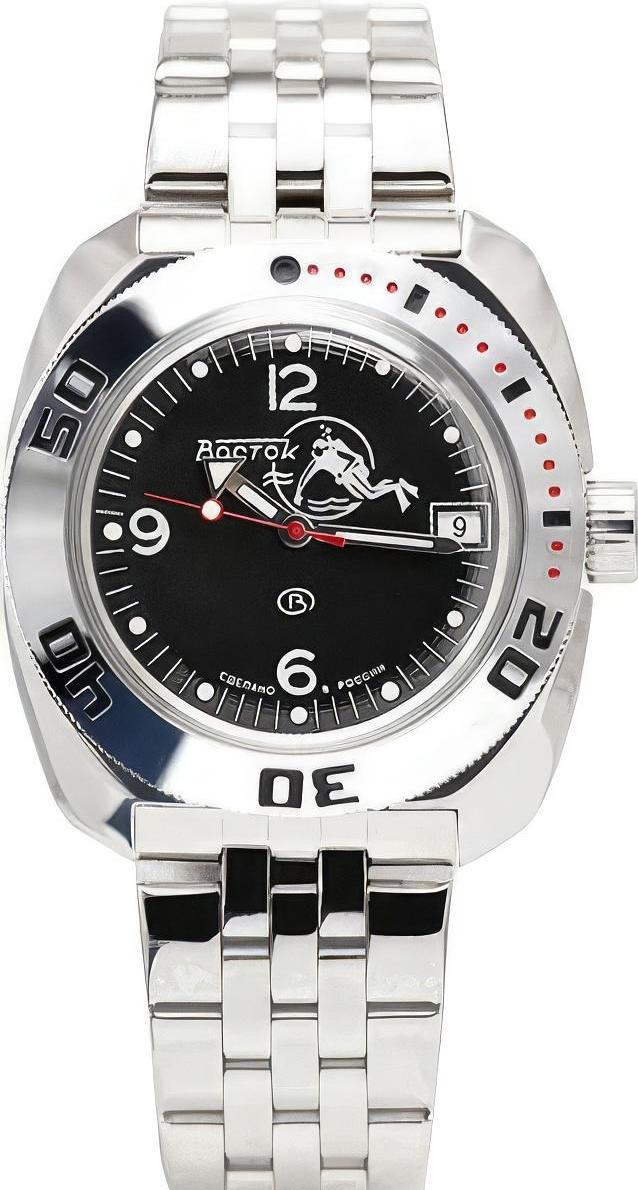 Мужские наручные часы Восток Командирские 710634. Автоматические с ручным подзаводом. Пружина механизма заводится автоматически благодаря естественным движениям владельца в процессе ежедневной носки часов. Также есть возможность ручного завода. Корпус изготовлен из высококачественной нержавеющей стали 316L с высокими антикоррозийными свойствами. На стрелки и отметки нанесен светонакопительный состав, благодаря этому считывать информацию с циферблата возможно и в темноте. На циферблате отображается текущее число месяца. Браслет из нержавеющей стали. Органическое стекло. Часы являются водонепроницаемыми до 20 Бар. Цвет корпуса: Черный. Цвет циферблата: Черный. Ширина (с заводной головкой): 42мм. Толщина: 12мм. Гарантия: 1 год.
