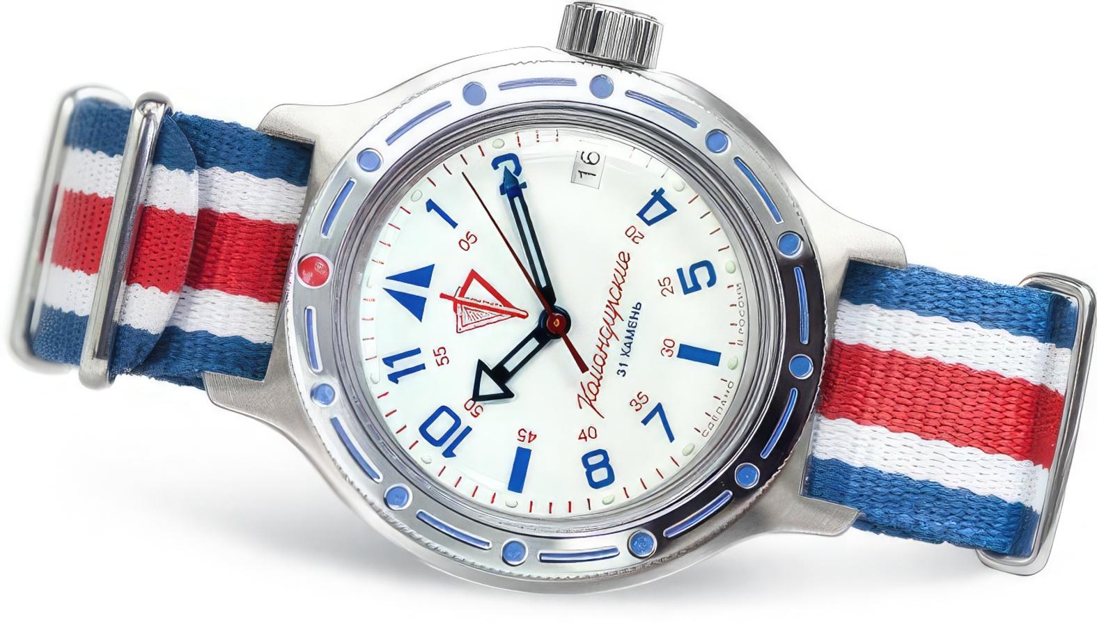 Мужские наручные часы Восток Командирские 72048Б. Механические с ручным подзаводом. Текстильный ремешок. Браслет из нержавеющей стали. Органическое стекло. На циферблате отображается текущее число месяца. Часы являются водонепроницаемыми до 20 Бар. Цвет циферблата: Серебристый. Цвет корпуса: Белый. На стрелки и отметки нанесен светонакопительный состав, благодаря этому считывать информацию с циферблата возможно и в темноте. Толщина: 13 мм. Гарантия: 1 год.