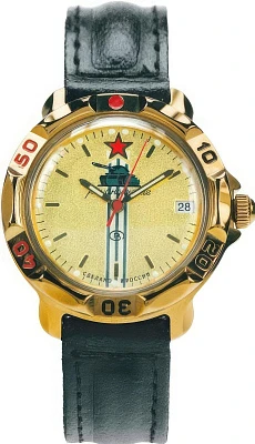 Мужские наручные часы Восток Командирские 819075. Механические с ручным подзаводом. Корпус изготовлен из высококачественной часовой латуни с высокими антикоррозийными свойствами. На стрелки и отметки нанесен светонакопительный состав, благодаря этому считывать информацию с циферблата возможно и в темноте. На циферблате отображается текущее число месяца. Ремешок изготовлен из кожи. Прочное, устойчивое к царапинам минеральное стекло защищает часы от повреждений.Часы являются водонепроницаемыми до 3 Бар. Цвет корпуса: Двухцветный. Цвет циферблата: Золотистый. Ширина (с заводной головкой): 40мм. Толщина: 10мм. Гарантия: 1 год.