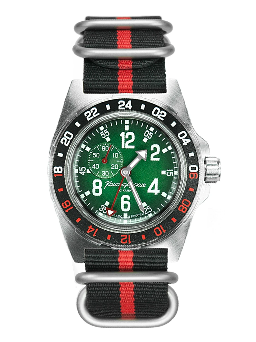 Мужские наручные часы Восток Командирские 95057Б. Механические с ручным подзаводом. Текстильный ремешок. Ударопрочная конструкция часов защищает от ударов и вибрации. Аккумулятор обеспечивает часы достаточным питанием приблизительно на 10 лет. Отображение времени возможно в 12-часовом или 24-часовом формате. Браслет из нержавеющей стали. Органическое стекло. Часы являются водонепроницаемыми до 20 Бар. Цвет циферблата: Черный. Цвет корпуса: Зеленый. На стрелки и отметки нанесен светонакопительный состав, благодаря этому считывать информацию с циферблата возможно и в темноте. Высота (с ушками): 49 мм. Толщина: 15 мм. Гарантия: 1 год.