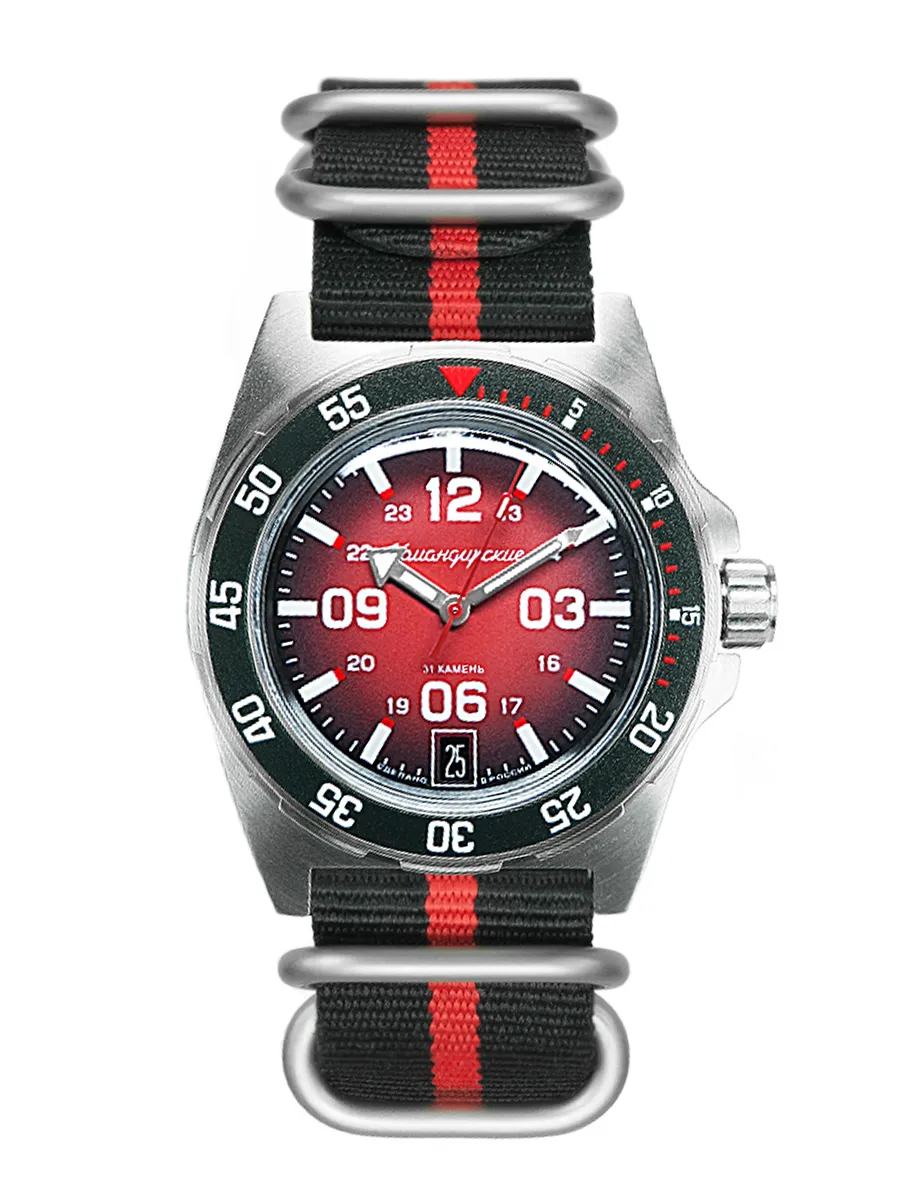 Мужские наручные часы Восток Командирские 95059Б. Механические с ручным подзаводом. Текстильный ремешок. Ударопрочная конструкция часов защищает от ударов и вибрации. Аккумулятор обеспечивает часы достаточным питанием приблизительно на 10 лет. Браслет из нержавеющей стали. Органическое стекло. На циферблате отображается текущее число месяца. Часы являются водонепроницаемыми до 20 Бар. Цвет циферблата: Черный. Цвет корпуса: Красный. На стрелки и отметки нанесен светонакопительный состав, благодаря этому считывать информацию с циферблата возможно и в темноте. Высота (с ушками): 49 мм. Толщина: 15 мм. Гарантия: 1 год.