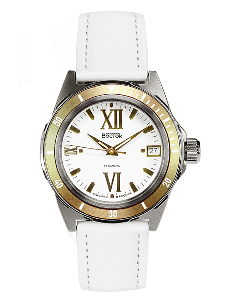 Мужские наручные часы Восток Мегаполис 75011А. Механические с ручным подзаводом. Ремешок изготовлен из кожи. Ударопрочная конструкция часов защищает от ударов и вибрации. Аккумулятор обеспечивает часы достаточным питанием приблизительно на 10 лет. Браслет из нержавеющей стали. Прочное, устойчивое к царапинам минеральное стекло защищает часы от повреждений. На циферблате отображается текущее число месяца. Часы являются водонепроницаемыми до 3 Бар. Цвет циферблата: Желтое золото. Цвет корпуса: Белый. На стрелки и отметки нанесен светонакопительный состав, благодаря этому считывать информацию с циферблата возможно и в темноте. Высота (с ушками): 45 мм. Толщина: 15 мм. Гарантия: 1 год.