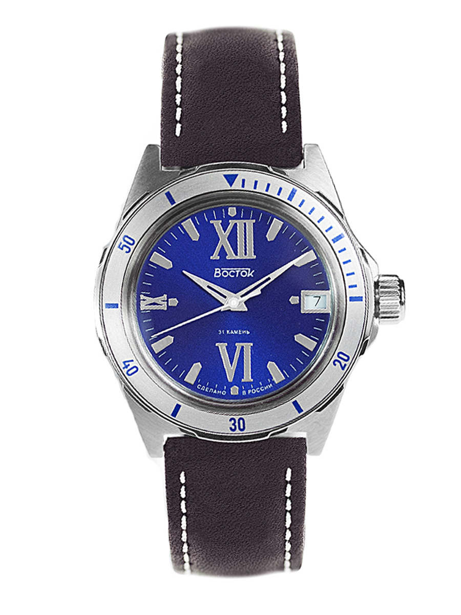 Мужские наручные часы Восток Мегаполис 75012А. Механические с ручным подзаводом. Ремешок изготовлен из кожи. Ударопрочная конструкция часов защищает от ударов и вибрации. Аккумулятор обеспечивает часы достаточным питанием приблизительно на 10 лет. Браслет из нержавеющей стали. Прочное, устойчивое к царапинам минеральное стекло защищает часы от повреждений. На циферблате отображается текущее число месяца. Часы являются водонепроницаемыми до 3 Бар. Цвет циферблата: Серебристый. Цвет корпуса: Синий. Высота (с ушками): 45 мм. Толщина: 15 мм. Гарантия: 1 год.