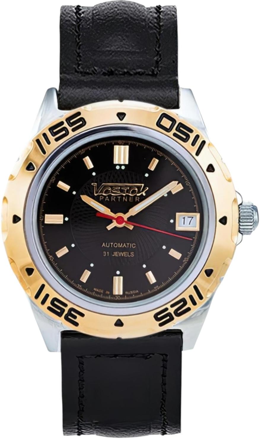Мужские наручные часы Восток Партнер 251148. Механические с ручным подзаводом. Ремешок изготовлен из кожи. Браслет из нержавеющей стали. Прочное, устойчивое к царапинам минеральное стекло защищает часы от повреждений. На циферблате отображается текущее число месяца. Часы являются водонепроницаемыми до 3 Бар. Цвет циферблата: Серебристый. Цвет циферблата: Желтое золото. Цвет корпуса: Черный. На стрелки и отметки нанесен светонакопительный состав, благодаря этому считывать информацию с циферблата возможно и в темноте. Толщина: 12 мм. Гарантия: 1 год.