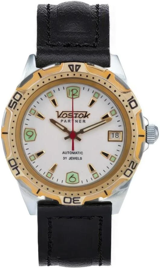 Мужские наручные часы Восток Партнер 251150. Механические с ручным подзаводом. Ремешок изготовлен из кожи. Браслет из нержавеющей стали. Прочное, устойчивое к царапинам минеральное стекло защищает часы от повреждений. На циферблате отображается текущее число месяца. Часы являются водонепроницаемыми до 3 Бар. Цвет циферблата: Серебристый. Цвет циферблата: Желтое золото. Цвет корпуса: Белый. На стрелки и отметки нанесен светонакопительный состав, благодаря этому считывать информацию с циферблата возможно и в темноте. Толщина: 12 мм. Гарантия: 1 год.