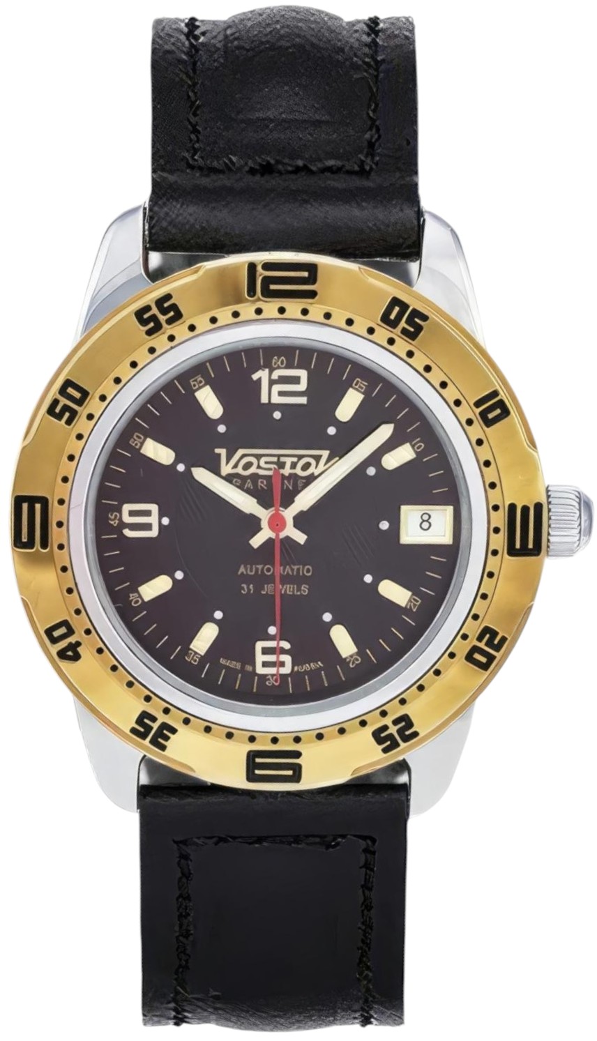 Мужские наручные часы Восток Партнер 291146. Механические с ручным подзаводом. Ремешок изготовлен из кожи. Браслет из нержавеющей стали. Прочное, устойчивое к царапинам минеральное стекло защищает часы от повреждений. На циферблате отображается текущее число месяца. Часы являются водонепроницаемыми до 3 Бар. Цвет циферблата: Серебристый. Цвет циферблата: Желтое золото. Цвет корпуса: Черный. На стрелки и отметки нанесен светонакопительный состав, благодаря этому считывать информацию с циферблата возможно и в темноте. Толщина: 12 мм. Гарантия: 1 год.
