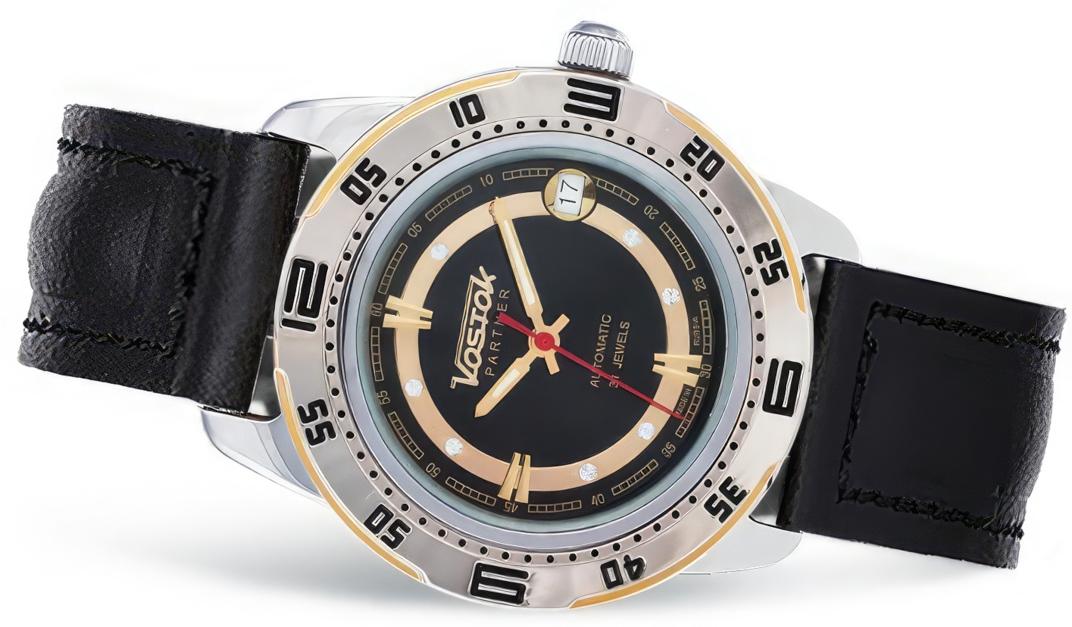 Мужские наручные часы Восток Партнер 291279. Механические с ручным подзаводом. Ремешок изготовлен из кожи. Браслет из нержавеющей стали. Прочное, устойчивое к царапинам минеральное стекло защищает часы от повреждений. На циферблате отображается текущее число месяца. Часы являются водонепроницаемыми до 3 Бар. Цвет циферблата: Серебристый. Цвет циферблата: Желтое золото. Цвет корпуса: Черный. На стрелки и отметки нанесен светонакопительный состав, благодаря этому считывать информацию с циферблата возможно и в темноте. Толщина: 10 мм. Гарантия: 1 год.