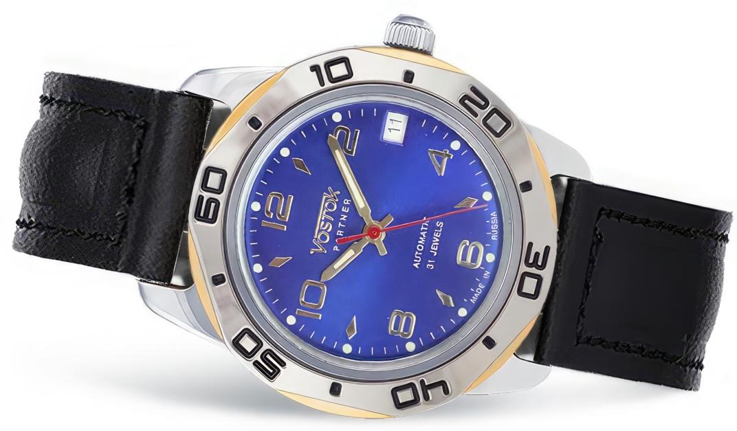 Мужские наручные часы Восток Партнер 29153А. Механические с ручным подзаводом. Ремешок изготовлен из кожи. Браслет из нержавеющей стали. Прочное, устойчивое к царапинам минеральное стекло защищает часы от повреждений. На циферблате отображается текущее число месяца. Часы являются водонепроницаемыми до 3 Бар. Цвет циферблата: Серебристый. Цвет циферблата: Желтое золото. Цвет корпуса: Синий. На стрелки и отметки нанесен светонакопительный состав, благодаря этому считывать информацию с циферблата возможно и в темноте. Толщина: 13 мм. Гарантия: 1 год.
