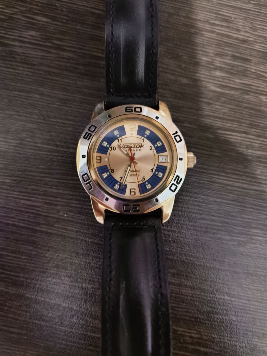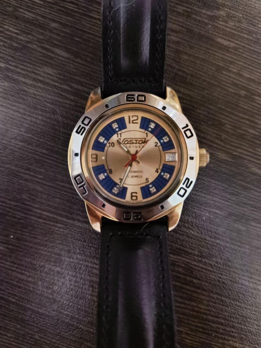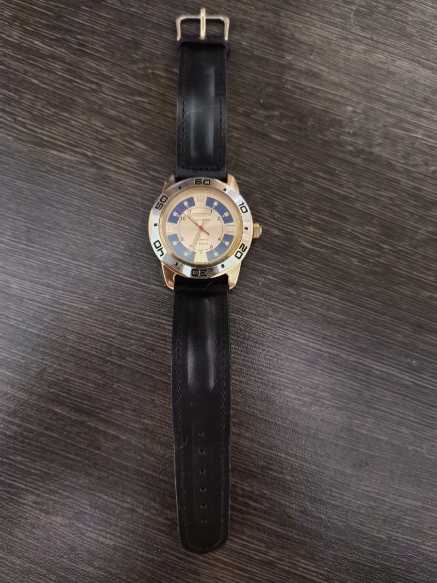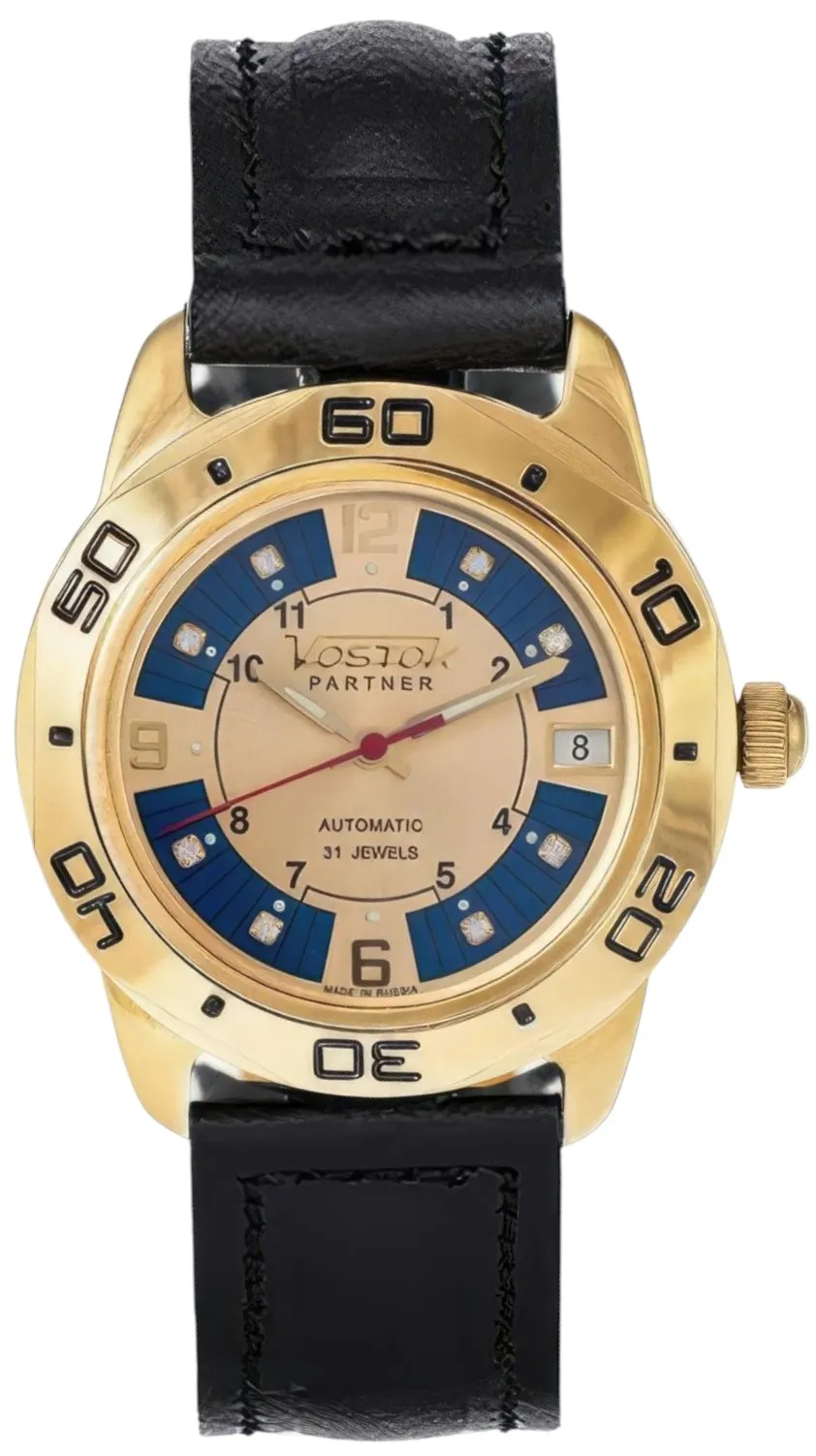 Мужские наручные часы Восток Партнер 299097. Механические с ручным подзаводом. Ремешок изготовлен из кожи. Браслет из нержавеющей стали. Прочное, устойчивое к царапинам минеральное стекло защищает часы от повреждений. На циферблате отображается текущее число месяца. Часы являются водонепроницаемыми до 3 Бар. Цвет циферблата: Желтое золото. Цвет корпуса: Синий. Цвет корпуса: Золотистый. Толщина: 10 мм. Гарантия: 1 год.