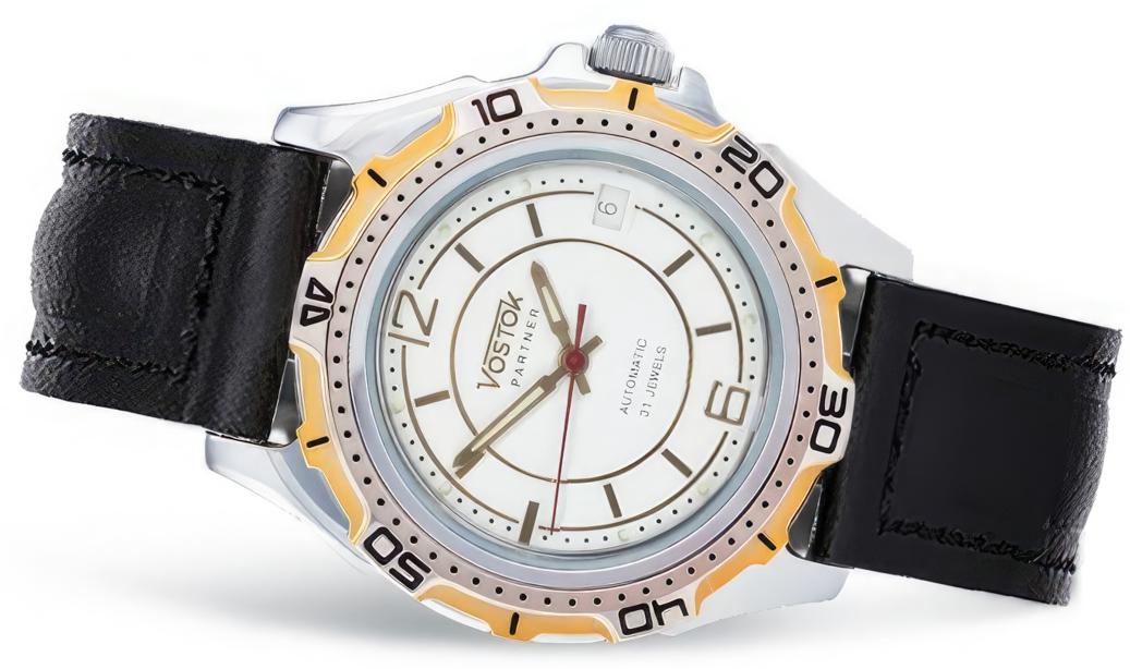 Мужские наручные часы Восток Партнер 30155А. Механические с ручным подзаводом. Ремешок изготовлен из кожи. Браслет из нержавеющей стали. Прочное, устойчивое к царапинам минеральное стекло защищает часы от повреждений. На циферблате отображается текущее число месяца. Часы являются водонепроницаемыми до 3 Бар. Цвет циферблата: Серебристый. Цвет циферблата: Желтое золото. Цвет корпуса: Белый. На стрелки и отметки нанесен светонакопительный состав, благодаря этому считывать информацию с циферблата возможно и в темноте. Толщина: 12 мм. Гарантия: 1 год.