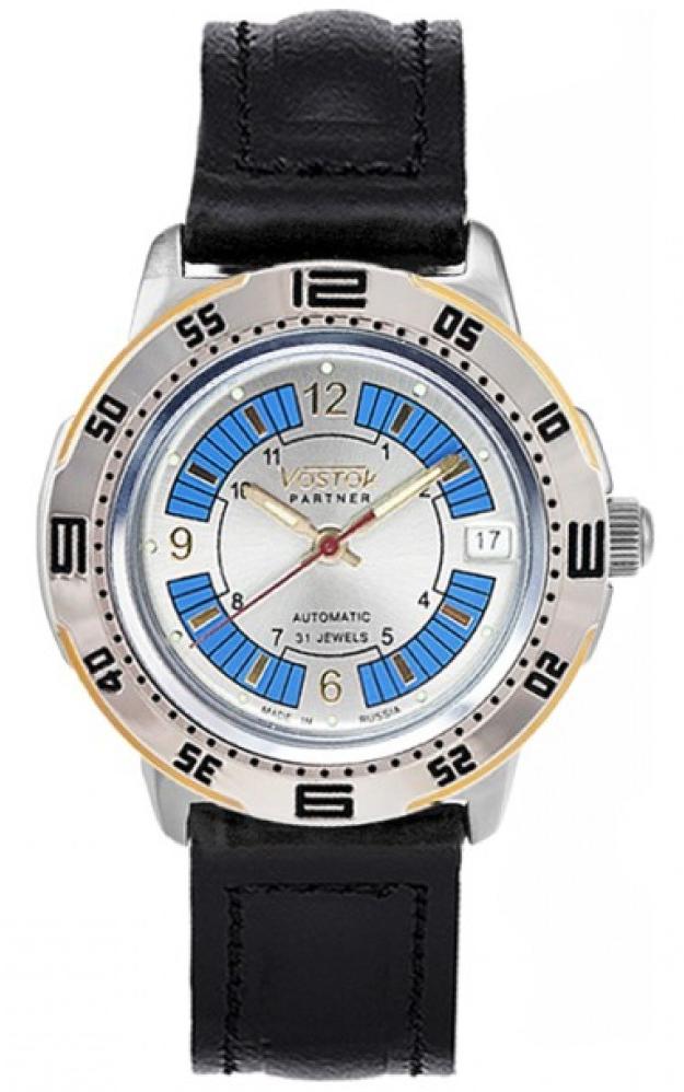 Мужские наручные часы Восток Партнер 31162А. Механические с ручным подзаводом. Ремешок изготовлен из кожи. Браслет из нержавеющей стали. Прочное, устойчивое к царапинам минеральное стекло защищает часы от повреждений. На циферблате отображается текущее число месяца. Часы являются водонепроницаемыми до 3 Бар. Цвет циферблата: Серебристый. Цвет корпуса: Серебристый. На стрелки и отметки нанесен светонакопительный состав, благодаря этому считывать информацию с циферблата возможно и в темноте. Толщина: 12 мм. Гарантия: 1 год.