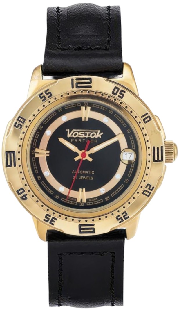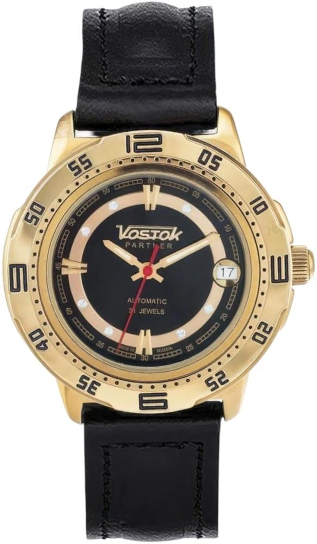 Мужские наручные часы Восток Партнер 319279. Механические с ручным подзаводом. Ремешок изготовлен из кожи. Браслет из нержавеющей стали. Прочное, устойчивое к царапинам минеральное стекло защищает часы от повреждений. На циферблате отображается текущее число месяца. Часы являются водонепроницаемыми до 3 Бар. Цвет циферблата: Желтое золото. Цвет корпуса: Черный. Цвет корпуса: Золотистый. На стрелки и отметки нанесен светонакопительный состав, благодаря этому считывать информацию с циферблата возможно и в темноте. Толщина: 12 мм. Гарантия: 1 год.