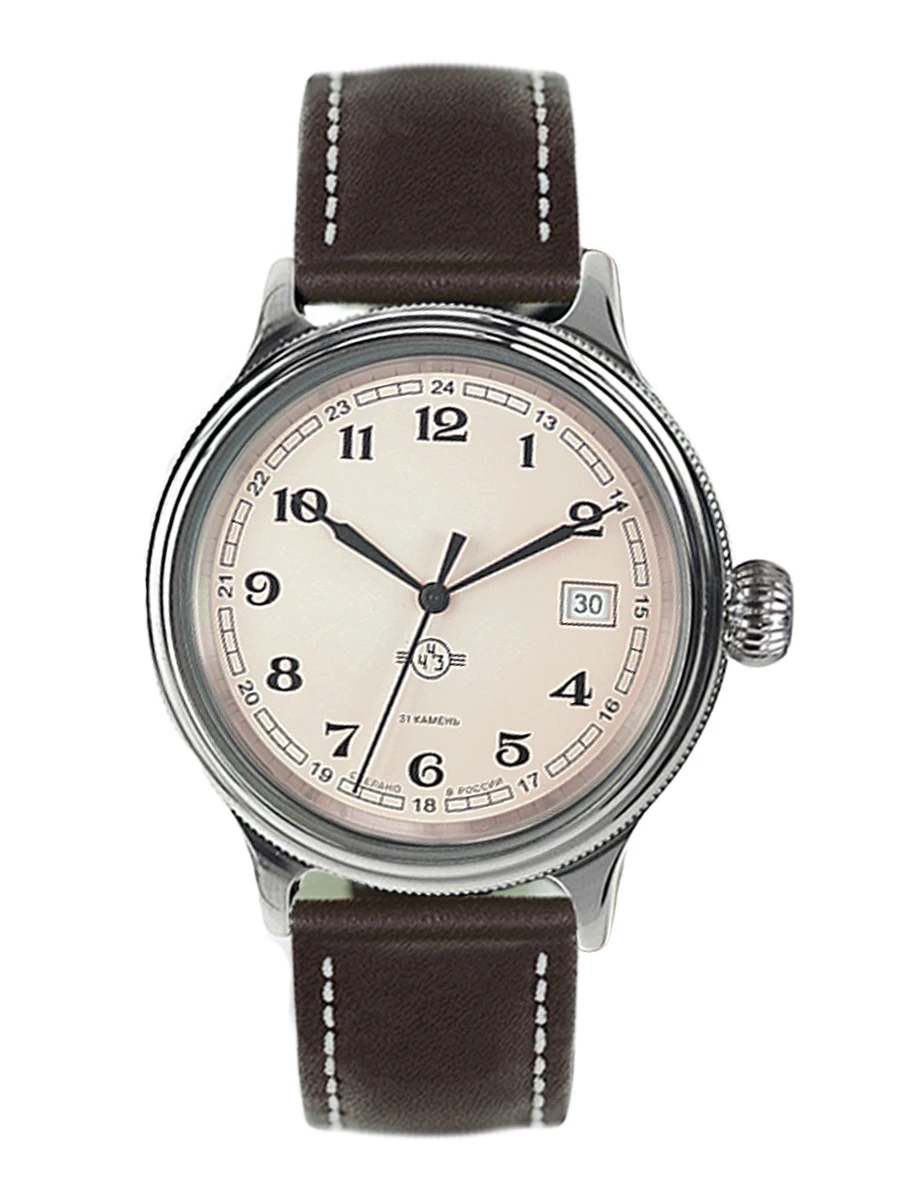 Мужские наручные часы Восток Ретро К-43 540962. Механические с ручным подзаводом. Ремешок изготовлен из кожи. Браслет из нержавеющей стали. Прочное, устойчивое к царапинам минеральное стекло защищает часы от повреждений. На циферблате отображается текущее число месяца. Часы являются водонепроницаемыми до 3 Бар. Цвет циферблата: Серебристый. Цвет корпуса: Бежевый. Высота (с ушками): 50 мм. Толщина: 11 мм. Гарантия: 1 год.