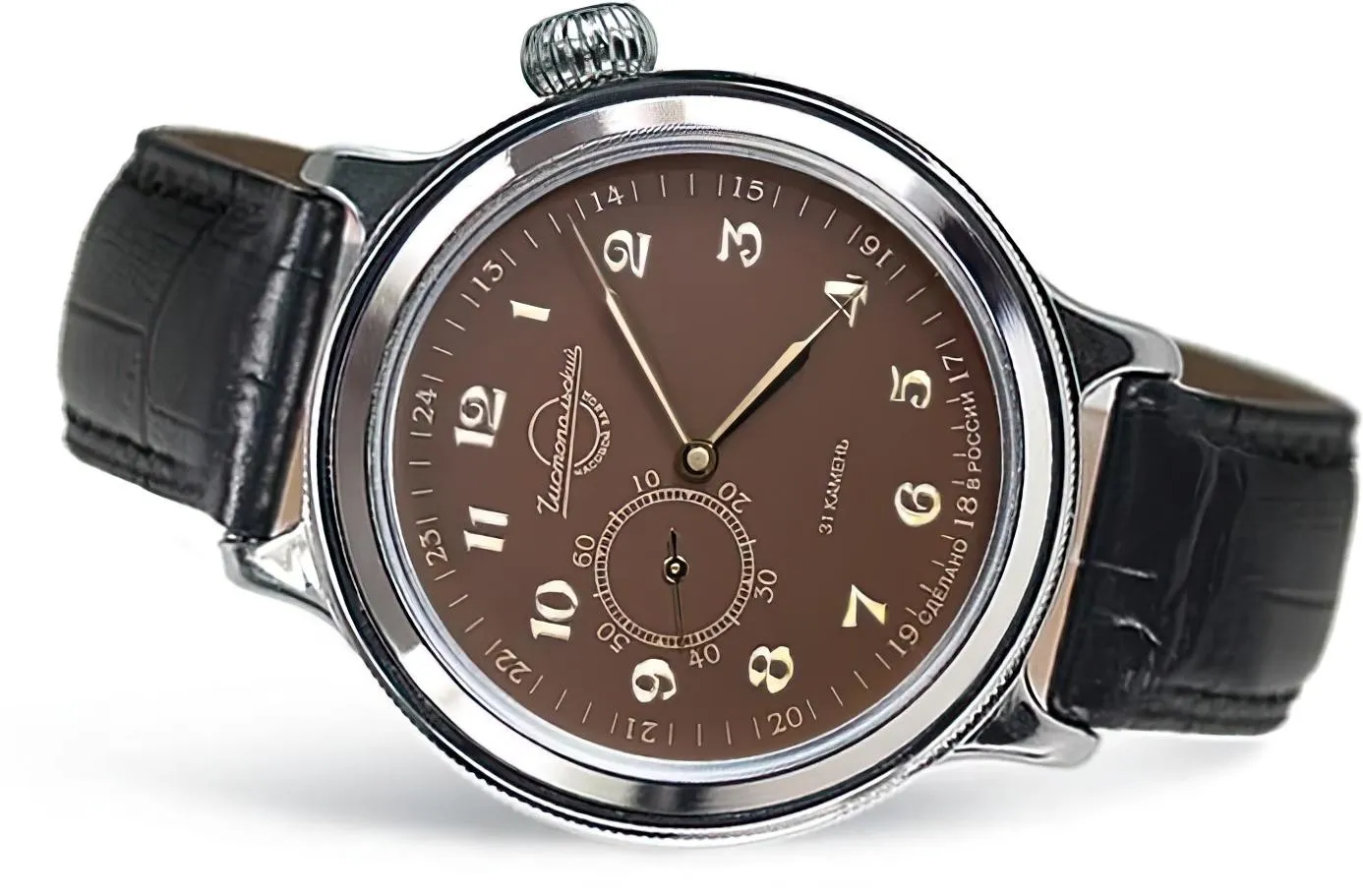 Мужские наручные часы Восток Ретро К-43 550996. Механические с ручным подзаводом. Корпус изготовлен из высококачественной нержавеющей стали 316L с высокими антикоррозийными свойствами. Ремешок изготовлен из кожи. Прочное, устойчивое к царапинам минеральное стекло защищает часы от повреждений. Часы являются водонепроницаемыми до 3 Бар. Цвет корпуса: Серебристый. Цвет циферблата: Коричневый. Ширина (с заводной головкой): 44мм. Толщина: 12мм. Гарантия: 1 год.